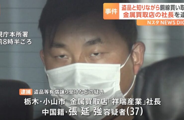 盗品の銅線ケーブルと知りながら買い取り 栃木県小山市の金属買い取り業者「祥瑞」の社長「佐藤強」こと中国籍の張 延強容疑者を逮捕 警視庁