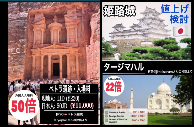 【姫路城】外国人入場料《4倍》値上げ検討→[海外入場料の常識]ペトラ遺跡の入場料『 50倍 』差!現地人: 1JD (¥220) 日本人: 50JD (¥11,000)/タージマハルの外国人入場料『22倍』