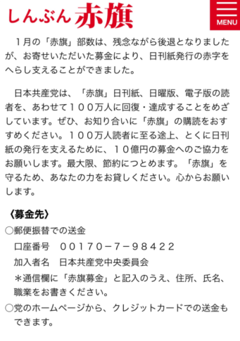 日本共産党が赤旗のために10億円くださいと言ってる、郵便口座00170-7-98422とは