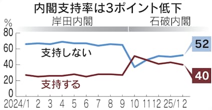 石破内閣の支持率は40%で、前回調査から3ポイント低下したが、大きな変動はなかった。「支持しない」と回答した人は52%で2ポイント上昇し、内閣に対する不満が増えていることがうかがえる。