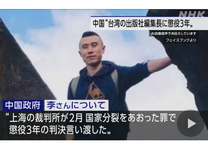 私はこの報道を見て、恐ろしさと同時に強い危機感を覚えました。台湾で中国批判の書籍を出版していた編集長・李延賀氏が、中国を訪れた際に消息を絶ち、その後、国家の分裂をあおったという罪で懲役三年の判決が言い渡されたというニュースです。