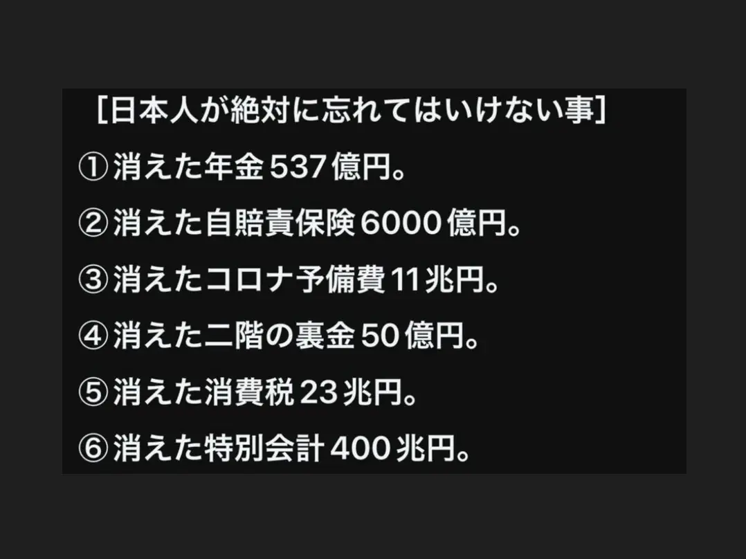 画像に書かれていた「日本人が絶対に忘れてはいけない事」というリストを見て、私は強い衝撃と、言いようのない怒りに近い感情を覚えました。日々まじめに働き、納税し、将来の生活のために年金を支払い続けている国民にとって、これらの「消えたお金」の数々は、単なる数字ではありません。それは、国民の信頼が裏切られた証であり、政治の劣化がもたらした現実でもあると思います。