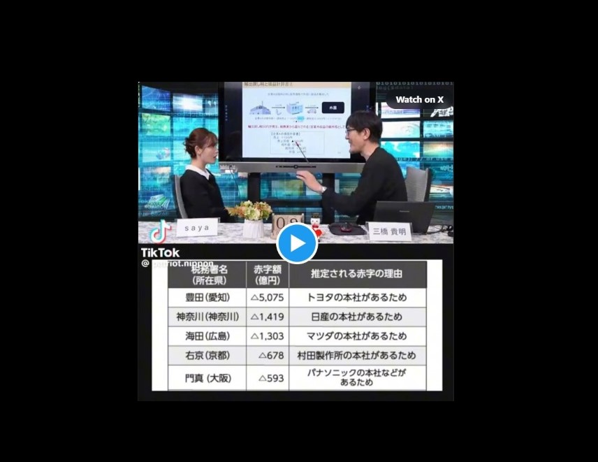 映像の中で示されていた表には、税務署ごとの赤字額と、その原因として「トヨタの本社があるため」「日産の本社があるため」といった説明が記載されていた。