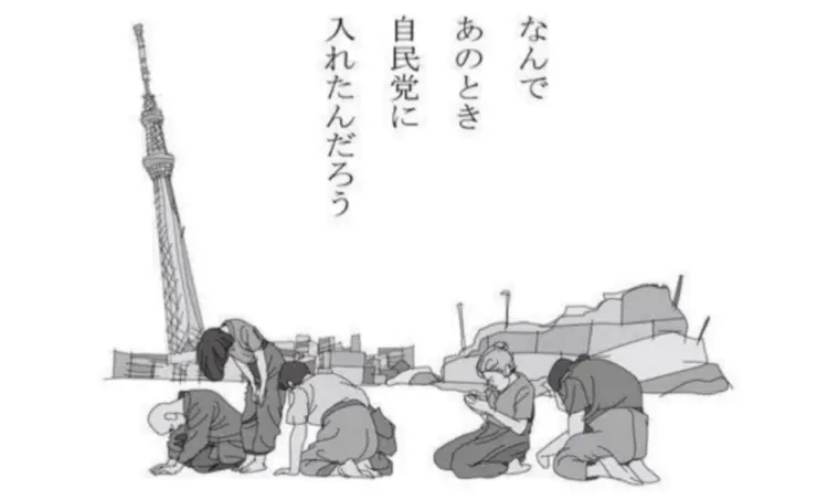 SNSでたまたま目にした、ある一枚のイラスト。そこには、崩れた都市のような背景とともに、人々が膝をつき、頭を垂れている姿。そして「なんであのとき自民党に入れたんだろう」という一文が添えられていた。あくまでイメージであり、現実とは違う表現だとは理解しているが、それでも私の心の中に、ある問いを投げかけたのは確かだった。