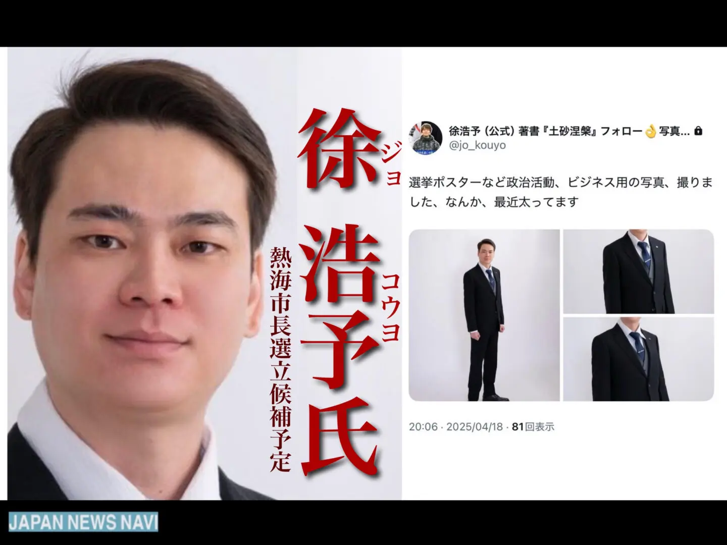 「選挙ポスターなど政治活動、ビジネス用の写真、撮りました」――この一文がSNS上で話題となりました。投稿の主は、中国出身で日本に帰化したとされる徐浩予氏。これまでにも反日的とも取れる発言を繰り返してきた人物であり、今回の投稿からは、熱海市長選への立候補に向けて動き出している様子がうかがえます。