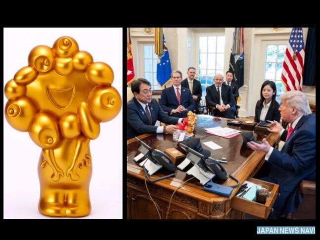 2025年4月、日本の赤沢亮正大臣が米国を訪れ、トランプ大統領と面会。その際に手土産として渡されたのが、大阪・関西万博の公式キャラクター「ミャクミャク」を模した金色の貯金箱だったという報道が注目を集めた。