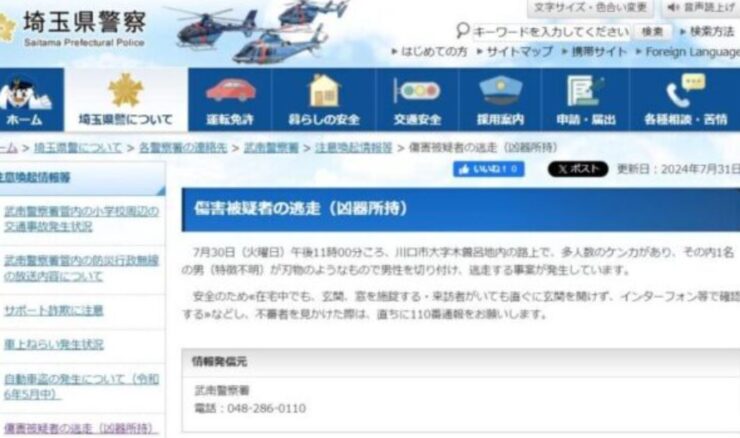 【埼玉県警】『川口市で男(特徴不明)が刃物のようなもので男性を切り付け、逃走する事案が発生しています』→外国人だという目撃情報を隠しSNSで呼びかけ[24/9]