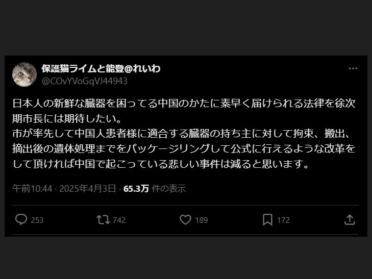 最近、X(旧Twitter)上で目にした投稿が、私に深い違和感と懸念を抱かせました。とあるユーザーが「日本人の新鮮な臓器を困っている中国の方に素早く送れ」と発言し、そのうえで、熱海市長選に立候補を予定している中国人の徐浩予氏に対して、「ぜひ法制化してほしい」と要望を述べたというものです。
