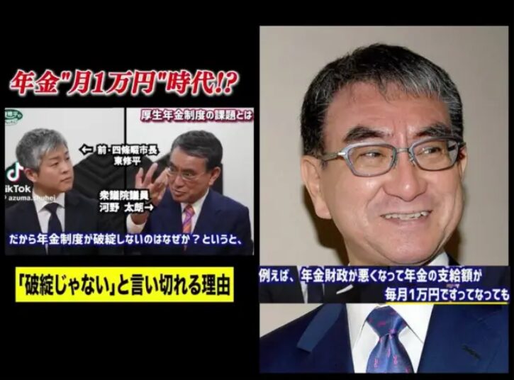 【悲報】河野太郎さん、年金1万円時代が来ることを破綻ではなく制度がそうなってるから仕方ないとの謎理論を展開してしまう。… pic.twitter.com/4Dt5KP5gc7