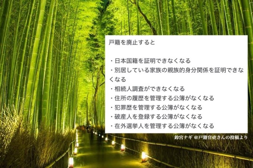 画像にあるように、戸籍がなくなれば「日本国籍を証明できない」「家族関係の証明ができなくなる」「相続人調査が不可能になる」など、非常に多くの問題が生じる可能性があります。私自身、今回の投稿を見て初めて知ったこともありましたが、戸籍というものが単なる紙の記録ではなく、私たちの社会生活を支える根幹にある仕組みなのだと改めて実感しました。