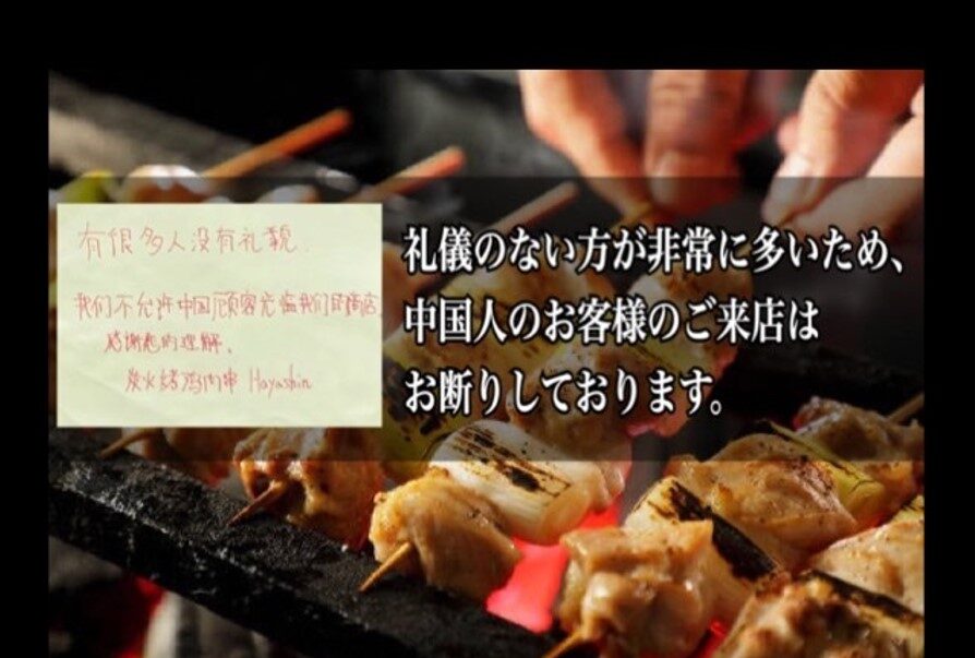 日本の焼き鳥店、中国簡体字で「中国人のお客様のご来店は、失礼な方が多いためお断りしております!」と掲示 中国人「この様な差別的な扱いは本当に残念」 pic.twitter.com/C2E2RAEc73
