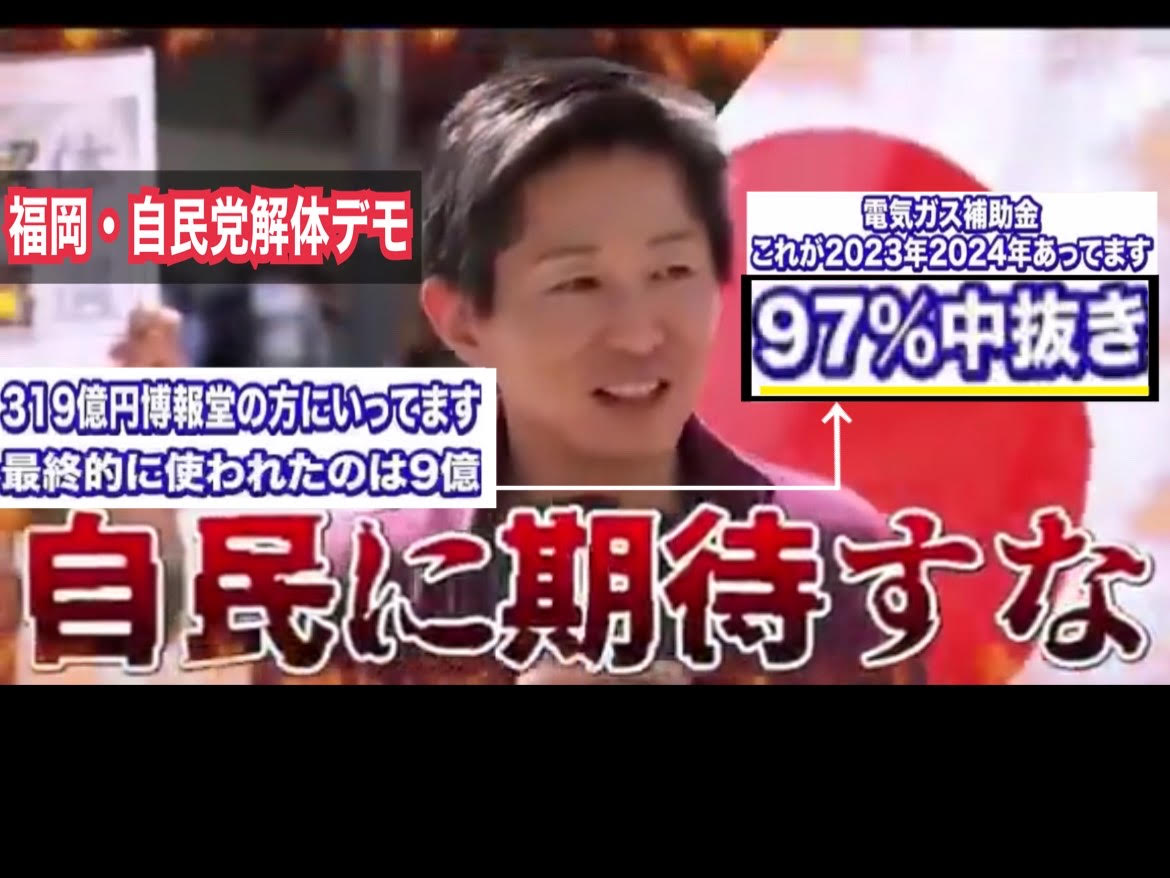 福岡で行われた自民党解体デモでは、一般市民の有志によって「補助金の97%が中抜きされている」とする衝撃的な実態が掲示され、ネット上でも大きな話題となった。電気・ガスの補助金、さらには博報堂関連の資金の流れまでが指摘され、「自民党に期待するな」という強いメッセージとともに、現政権への不信が可視化された瞬間だった。