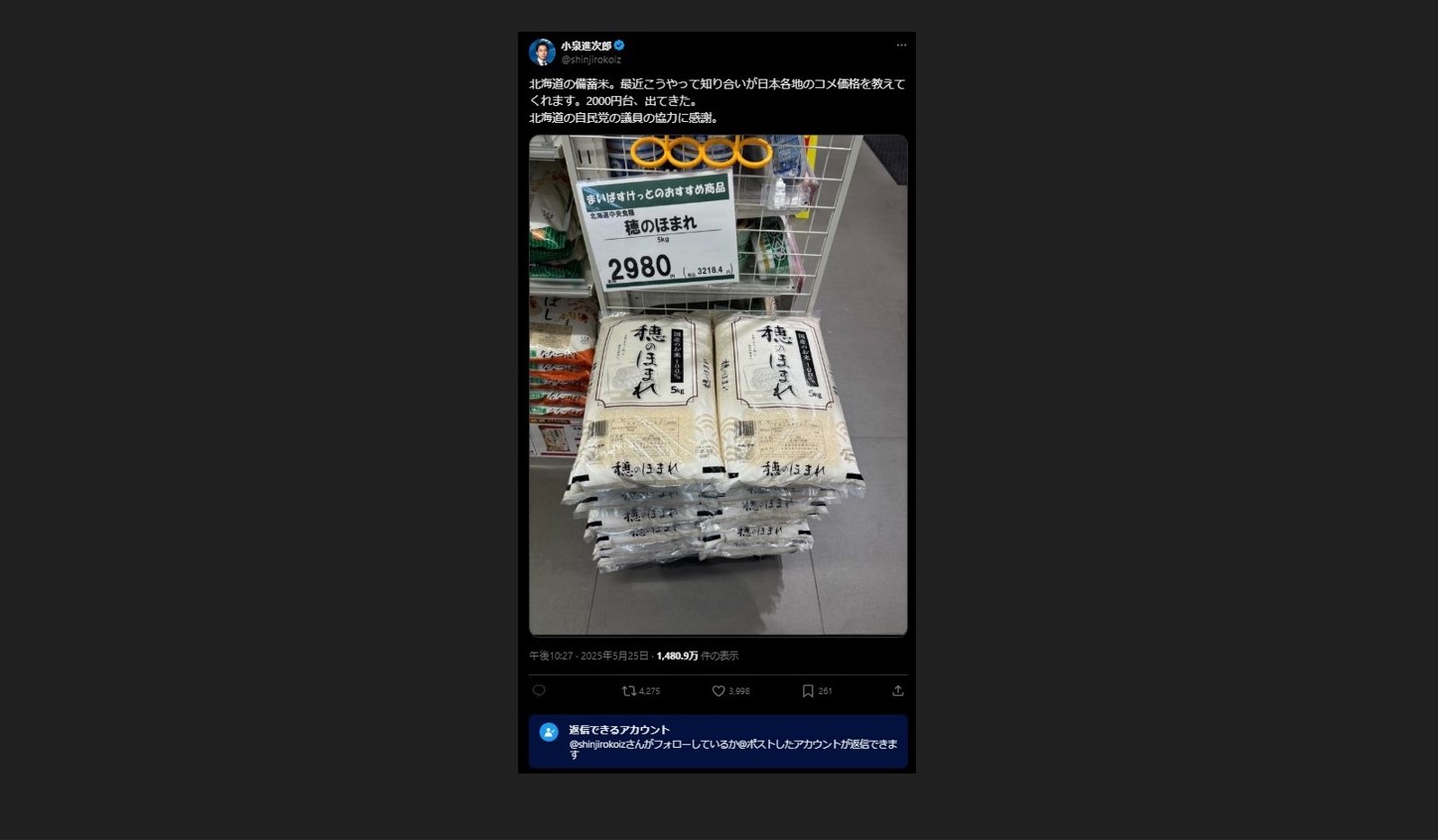 私は最近、SNSである政治家の投稿を見て、非常に強い違和感を覚えました。投稿の主は小泉進次郎氏。「北海道の備蓄米が2000円台で出てきた」と述べ、まるで自らの尽力で米価を抑えたかのように語っていました。しかし、その投稿のリプライ欄は制限され、一般のユーザーが直接意見を伝えることができない設定になっていたのです。
