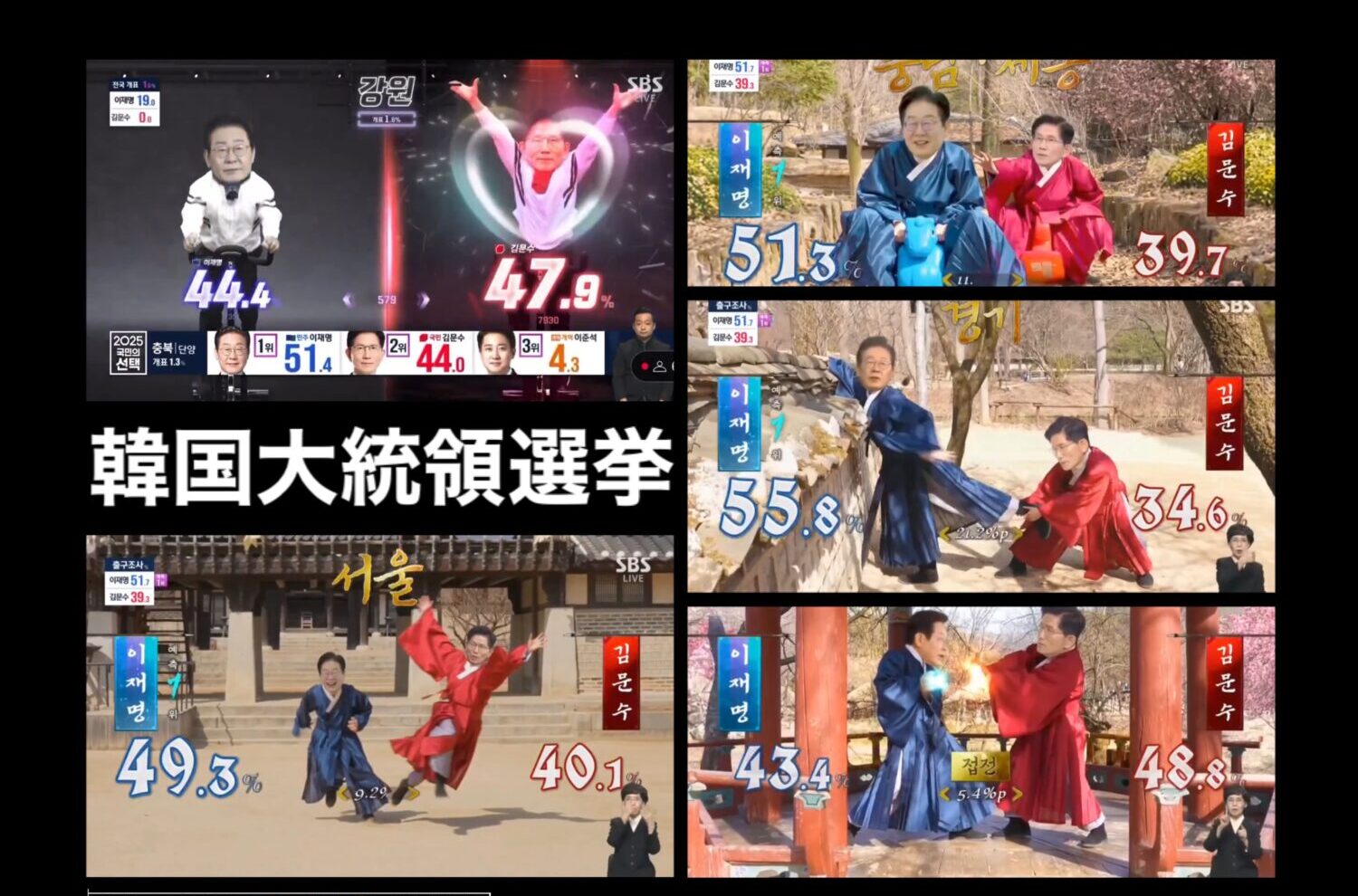 私はこの韓国の大統領選挙特番の映像を見て、最初は確かに「面白い」と思いました。キャラクター化された候補者が時代劇風の背景で飛び跳ねたり、ファンタジーのような演出で票数を競ったりする様子は、一見して目を引く内容で、話題性も高いと感じました。しかし、その後で冷静に考えると、「これは本当に民主主義の根幹である選挙報道の在り方として適切なのか?」という疑問が強く残りました。