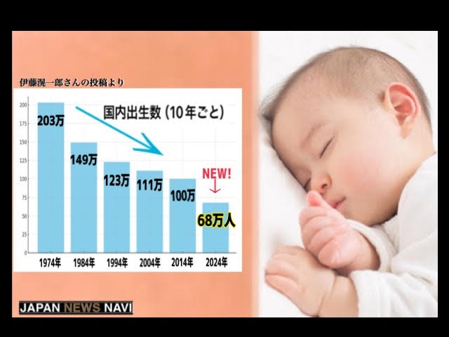 2024年の国内出生数がついに68万人にまで落ち込んだというデータが報じられた。10年ごとの推移を見ると、1974年の203万人から実に135万人も減っている計算になる。しかも、この減少は直線的ではなく、むしろ加速度的だ。私はこの数字を見て、もはや「少子化」という言葉では収まらない国家的危機に入っていると強く感じた。
