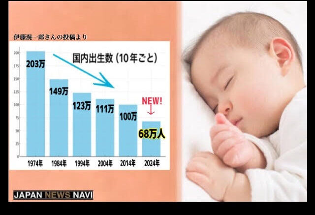 2024年の国内出生数がついに68万人にまで落ち込んだというデータが報じられた。10年ごとの推移を見ると、1974年の203万人から実に135万人も減っている計算になる。しかも、この減少は直線的ではなく、むしろ加速度的だ。私はこの数字を見て、もはや「少子化」という言葉では収まらない国家的危機に入っていると強く感じた。