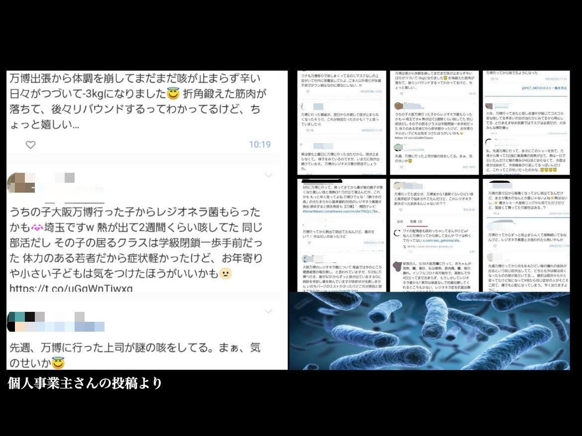もちろんレジオネラ菌とは限りませんが、万博協会は来場者から聞き取り調査をすべきだと思います。