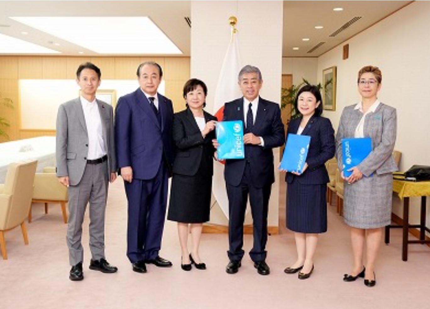 ユニセフ議員連盟の野田聖子会長、谷合正明副会長、御法川信英幹事長及び牧島かれん事務局長並びに杢尾雪絵ユニセフ東京事務所代表代行は、6月9日、岩屋毅外務大臣に表敬を実施した。野田ユニセフ議連会長などからは、紛争等により深刻な困難に直面する中、ユニセフが実施する様々な取組について紹介があるとともに、ユニセフへの支援強化を含む日本とユニセフとの協力関係の更なる強化について要請が行われた。