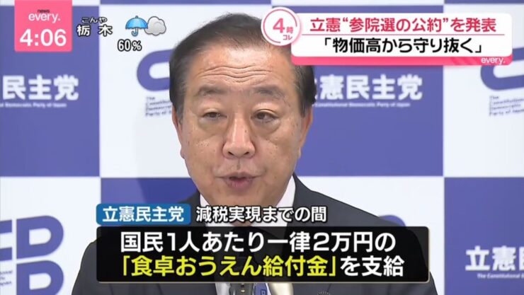 ニュースで立憲民主党が掲げる参院選の公約「国民1人あたり一律2万円の給付金」が報じられたのを見て、私は一瞬「これはありがたい話だ」と思った。確かに、物価高の影響を肌で感じる日々の中で、急な支出や生活の補填として現金の支給は助かる。ガソリン代、食品、光熱費、あらゆる生活コストが上昇している今、「少しでも現金を手にしたい」と思うのはごく自然な感覚だ。