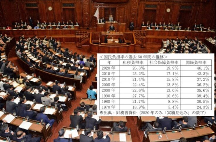 投稿の中で触れられていたもう一つの重大なポイントが「国民負担率」だ。掲載されていた表を見ると、ここ50年間で日本の国民負担率は大きく上昇している。2020年の時点で実質66.1%にも達しているというデータには驚かされた。