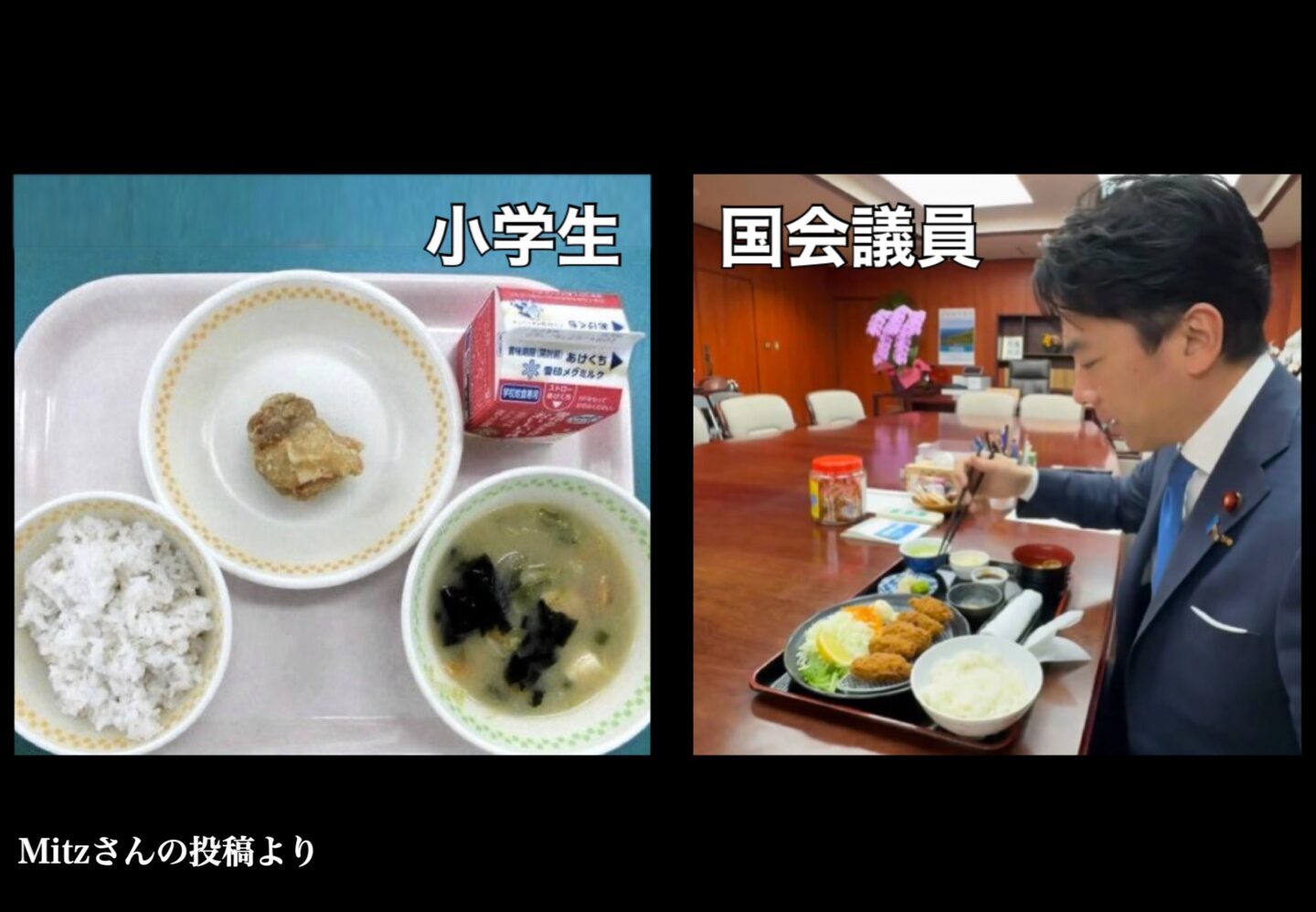 一枚の画像が、ここまで多くの感情を呼び起こすとは思わなかった。左側には小学生の給食、右側には国会議員と思われる人物の昼食が写っている。比較する意図は明確で、写真を見るだけで日本の「食の格差」がひと目で伝わってくる。私はこの画像を見て、さまざまな感情が交錯した。