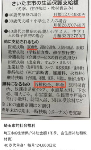 私は、さいたま市が示している生活保護の支給内容を見て、正直に言って驚きました。とりわけ、「無料になるもの」として挙げられている各種税金や年金、水道、NHK、さらには葬祭料まで対象となっている事実には、言葉を失いました。加えて、文中で触れられているように、これらの制度に外国人が含まれていることは、日本の社会保障制度全体を揺るがす深刻な問題であると私は考えます。