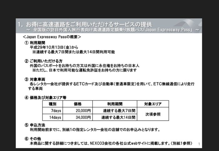 例えば、「Japan Expressway Pass」は、NEXCO東日本・中日本・西日本などが共同で提供しており、2017年10月13日から販売が開始されました。このパスは、7日間有効で20,000円、14日間有効で34,000円という料金設定で、全国の対象高速道路が乗り放題となります。利用条件として、海外パスポートを持つ訪日外国人旅行者または外国に永住権を持つ日本人が対象で、日本で有効な運転免許証が必要です。
