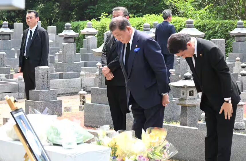 留魂碑前で黙禱(もくとう)をささげた後、記者団の取材に応じた。石破首相は安倍氏との思い出を振り返ったといい、「どうか天上から日本をお見守り、お導きいただきながら、この国を強く、ご加護あらん」と語った。