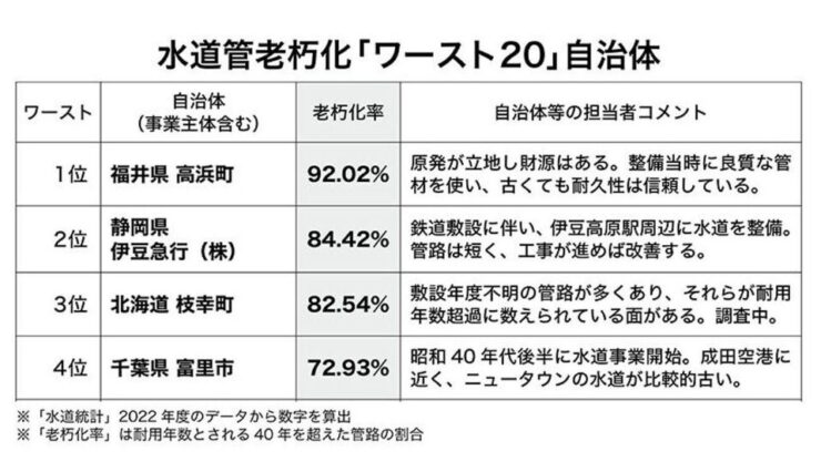 水道管「老朽化率」全国ワースト20自治体ランキング 3位北海道枝幸町、2位静岡県伊豆急行より“あぶない”自治体は?《リスト全公開》