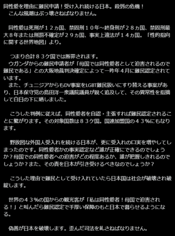 故国での同性愛または宗教の抑圧を持ち出すのは偽装難民に最後に残された手です。どちらも本人の言しか証拠はなく客観性はありません。昨年ウガンダの自称同性愛女性、中国の自称異端宗教信者が次々「難民」認定を受けました。小坂先生がこの危険性に言及してくださり本当に感謝しています