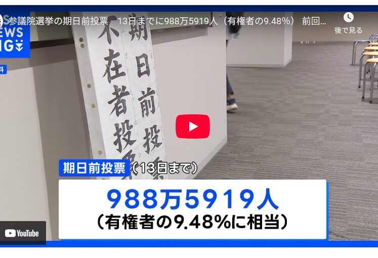 【速報】参議院選挙988万人超が期日前投票 有権者の9.48% 公示翌日から10日間で