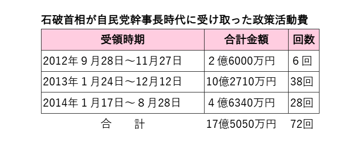 石破茂首相が自民党幹事長在任中の2年間で政策活動費を17億5050万円受領していたことが3日、政治資金収支報告書から分かりました。政策活動費は支出を受けた政治家個人名を書くだけでよいとされ、その先の使途はブラックボックスになっています。石破氏はこれまで使途を「可能な限り明らかにする」と述べており、幹事長時代の使途を公開するかどうかが問われます。(三浦誠)
