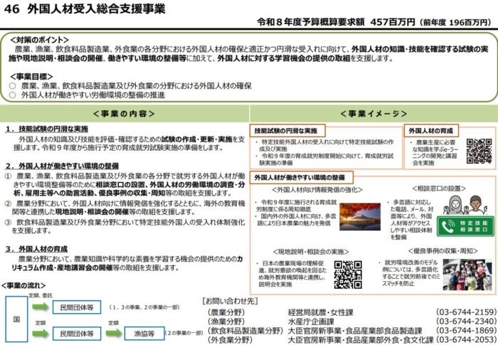 https://www.maff.go.jp/j/budget/pdf/r8yokyu_pr20.pdf - 農林水産省「令和8年度 概算要求(外国人材受入総合支援事業)」PDF