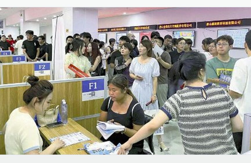 中国北部・河北省唐山市で7月末に開かれた合同就職面接会には、就職活動中の学生や、その保護者ら大勢が詰めかけていた。