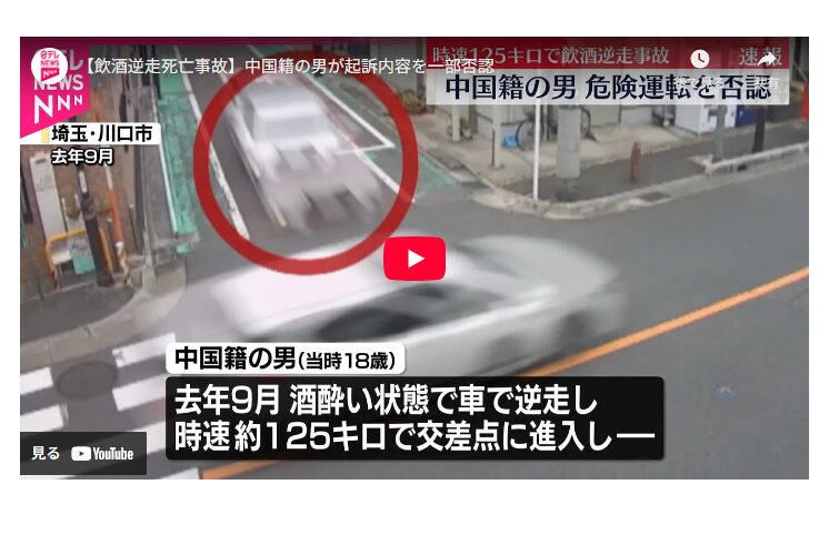 埼玉県川口市で昨年9月、飲酒運転で時速125キロもの速度で逆走し、衝突事故を起こして男性を死亡させたとして危険運転致死罪などに問われた中国籍の男(19)の裁判員裁判が、さいたま地裁で始まりました。検察によると被告は事故当日、友人とカラオケを楽しみ、焼酎を3杯ほど飲酒した上で運転を開始。その後、一方通行の道路を逆走し、制御困難な速度で交差点に進入し、会社役員の男性(当時51歳)の車に衝突して死亡させたとされています。