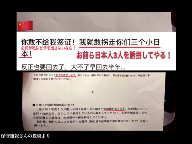 【中国人女性】ビザ申請で激怒「もし拒否されたら日本人3人を誘拐してやる!」保険料4年分未納指摘に逆上、SNS投稿に批判殺到