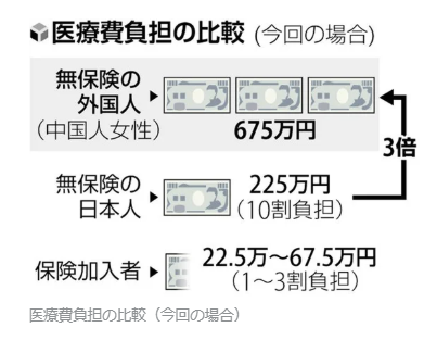 中国人女性が短期滞在で来日後に救急搬送され、無保険日本人の3倍(1点30円)=675万円を請求された