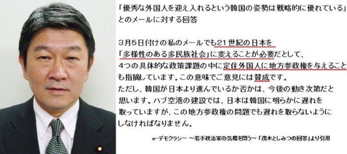 自民党総裁選へ出馬表明した茂木敏充「日本を韓国のような多様性のある多民族社会に変える事が必要!外国人に地方参政権を与える!」 https://t.co/o048lxFwaA
