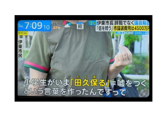 TBSの朝の情報番組で放送されたある映像が、いま大きな波紋を呼んでいます。伊東市民のコメントとして紹介されたものの中で、「小学生がいま『田久保る』=嘘をつくという言葉を作った」と語られた場面がありました。特定の苗字を使い、そのまま「嘘をつく」という否定的な意味を込めた表現を流したことに、強い批判が相次いでいます。