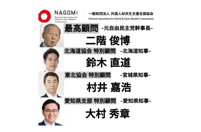 近ごろ、SNSで注目を集めているのが「一般財団法人外国人材共生支援全国協会(NAGOMi)」です。ホームページには役員や顧問の名簿が掲載されており、その顔ぶれは大物政治家や各界の著名人がずらりと並んでいます。最高顧問には二階俊博元自民党幹事長、顧問には大島理森元衆議院議長や林幹雄議員、藤井孝男元運輸大臣などが名を連ねています。