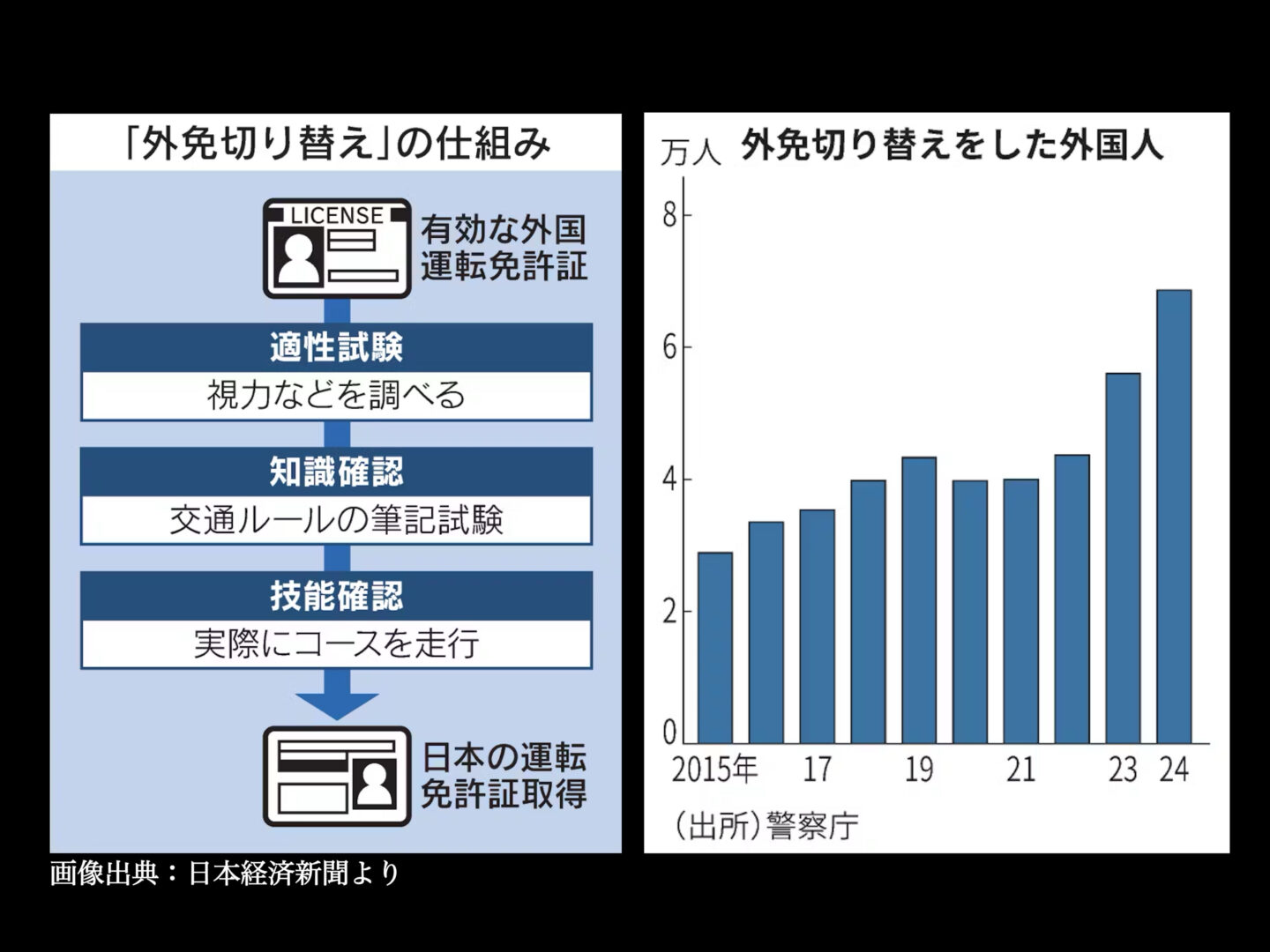 今月1日から運用が厳格化された外国人の運転免許切り替え制度は、多くの議論を呼んでいる。これまでホテル滞在中の短期観光客でも切り替えが可能で、筆記試験もわずか10問という簡易な内容だった。そのため、十分な知識がないまま免許を取得した外国人による事故や事件が後を絶たず、社会問題化していた。今回の改正により、住民票の写しを提出できない観光客は対象外となり、試験問題は50問に増加、合格ラインも90%へと引き上げられた。技能試験も横断歩道や踏切の通過といった課題を新たに導入し、日本人と同等の厳格な基準を適用することになった。
