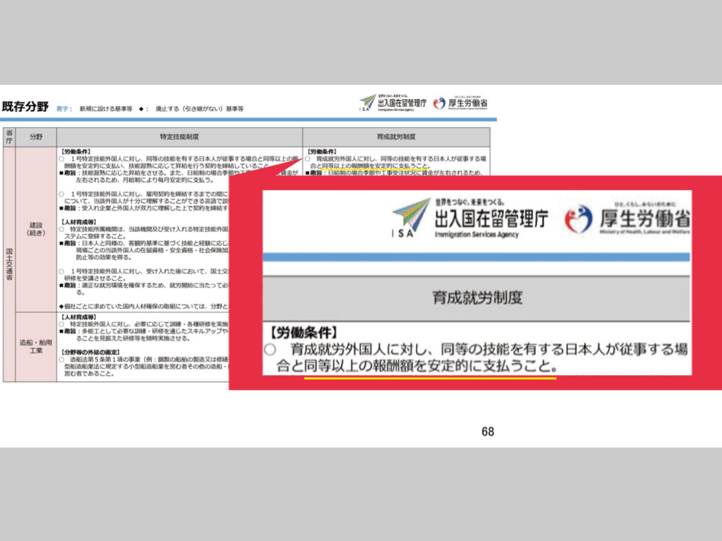 - 簡単な日本語と知識があるのは特定1号以上の試験に合格した人であって、育成就労期間は簡単な日本語ですら喋れない外国人が大量に入ってきます。 政府はその育成就労中の外国人に対して、日本人と同等以上の報酬を支払うように言っています