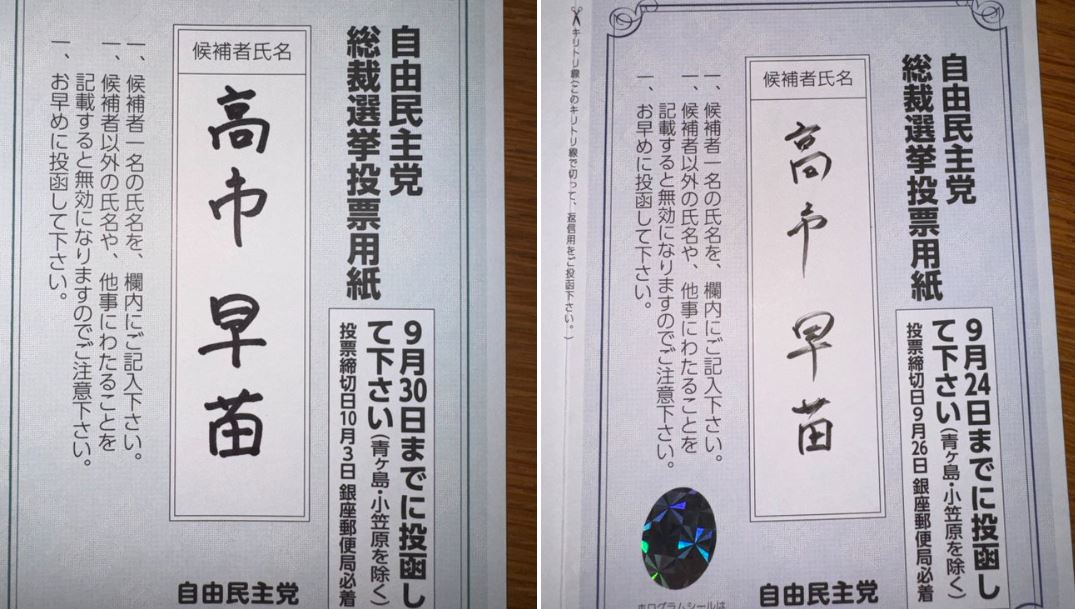 で、前回の投票用紙、ホログラムシールが貼られていたのだけど、今回は無し??#自民党総裁選挙 #高市早苗 pic.twitter.com/Y1l9kQPihX