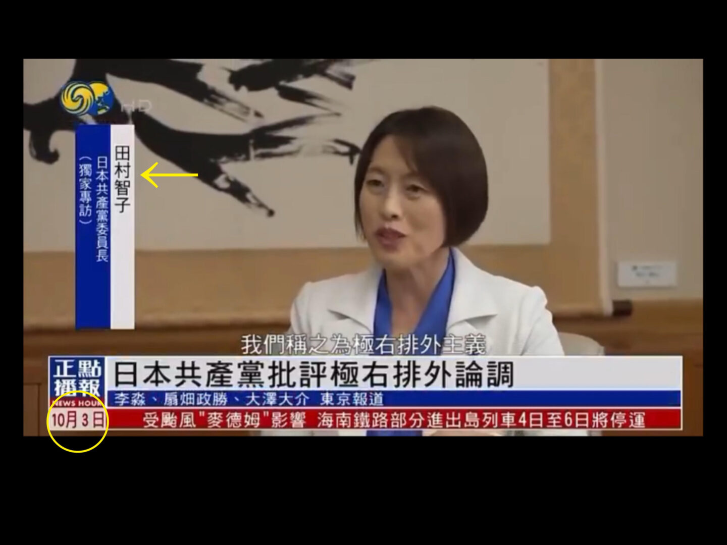 10/3中国共産党系メディア「鳳凰衛視」が日本共産党田村智子氏のインタビューを放送。