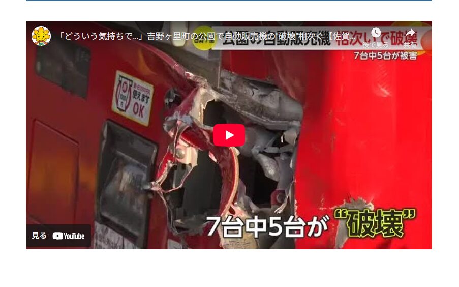 佐賀県吉野ヶ里町にある三田川中央公園で、複数の自動販売機が何者かによって破壊されているのが見つかった。サガテレビアプリに投稿された写真には、飲み物の取り出し口やお金の投入口が壊された自販機の姿が映っている。現場では公園内に設置されている7台のうち5台が同様の被害を受けていた。