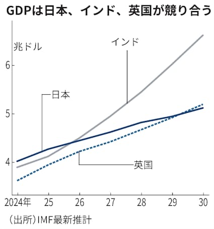 IMFの最新推計では日本は25年に4兆2798億ドルに達する。日印の逆転の時期は従来の予測より1年遅い。