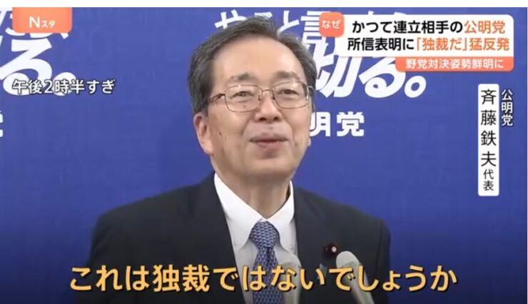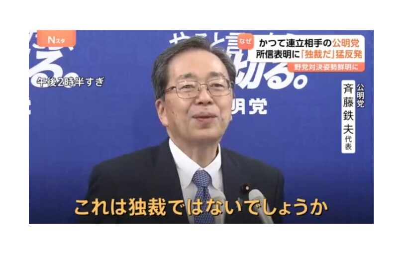 高市早苗総理が24日に行った所信表明演説に対し、公明党の斉藤鉄夫代表が強く反発した。斉藤氏は演説の一部表現を取り上げ、「これは独裁ではないか」と批判。連立を離脱した公明党として、高市政権の姿勢を厳しく問いただす構えを見せた。