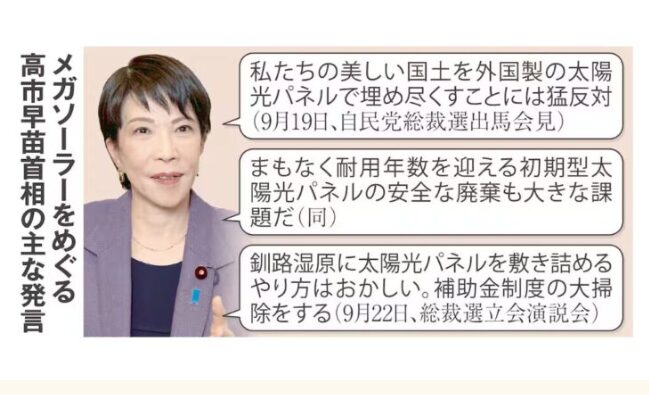 「私たちの美しい国土を外国製の太陽光パネルで埋め尽くすことには猛反対だ」。高市氏は9月19日、自民党総裁選への出馬会見でこう述べ、22日には太陽光などの補助金制度の見直しを主張した。