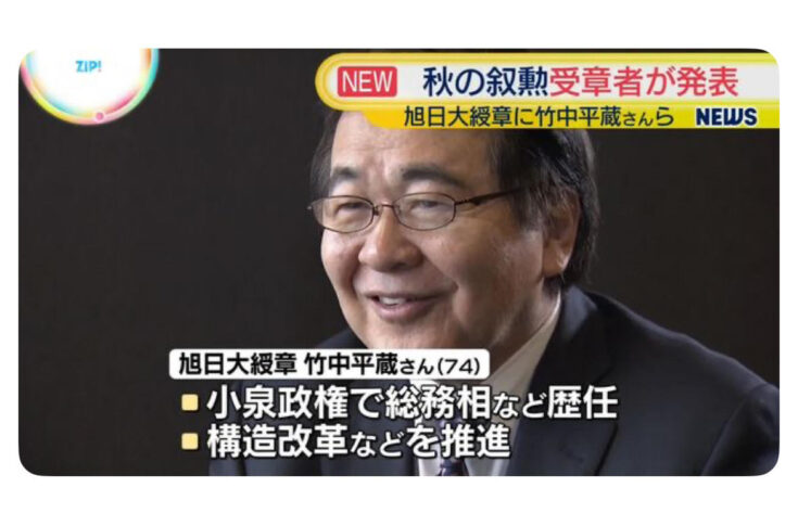 秋の叙勲で竹中平蔵氏が旭日大綬章を受章