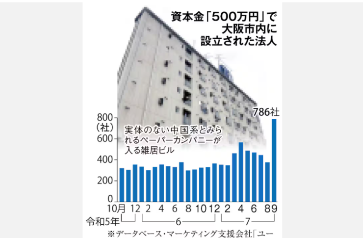 日本で外国人が起業する際に必要な在留資格「経営・管理」の取得要件が厳格化される直前、大阪市内で中国系とみられる法人の設立が相次いでいた。特に9月、最低資本金500万円での設立が前月の倍に跳ね上がり、厳格化を前にした「駆け込み起業」が確認された。代表者住所が中国にある法人も多く、実態のない“ペーパーカンパニー”が少なくないとみられている。